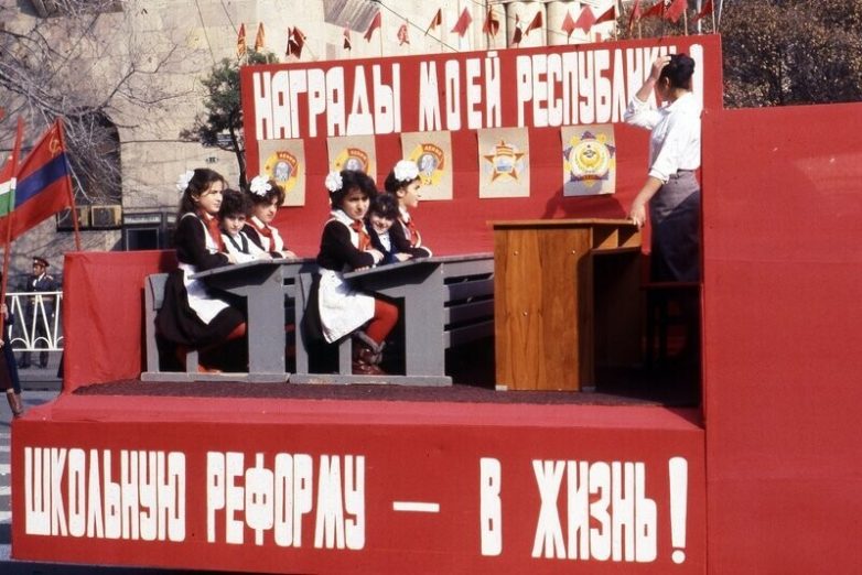 Судя по этому снимку ноябрьской праздничной демонстрации в Армении, была тогда в СССР какая-то школьная реформа