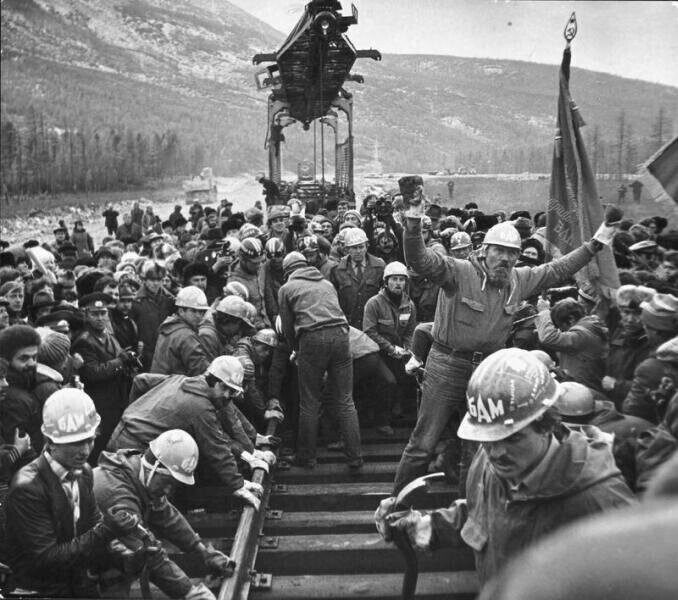 Укладывается последнее звено БАМа. Стыковка Александр Абаза, 29 сентября 1984 года, Читинская обл., ж/д станция Балбухта