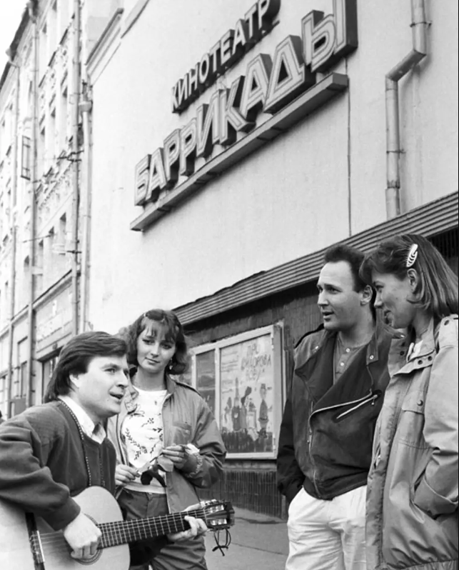 Певец и композитор Григорий Гладков исполняет свои песни у кинотеатра «Баррикады», 1986 год