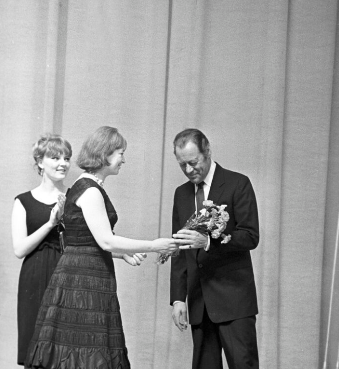 Советские актрисы Марианна Вертинская и Клара Лучко приветствуют английского актера Рекса Харрисона, 1965 год