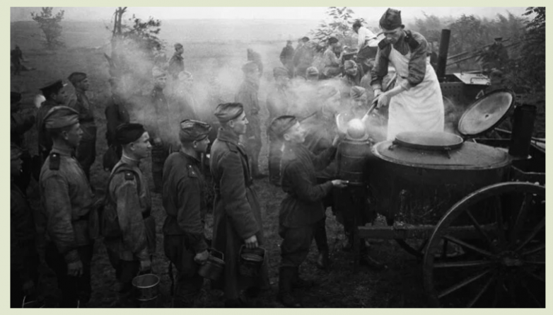 Блюда готовились нехитрые, зачастую повар произвольно мешал в котле мясо, крупы, овощи – все, что имелось под рукой. На выходе мог получиться кулеш (жидкая каша с мясом) или «овощной разброд» (из мемуаров историка кулинарии Вильяма Похлебкина). «Щи да каша – пища наша», – повторяли бойцы, в точности описывая фронтовые будни.
