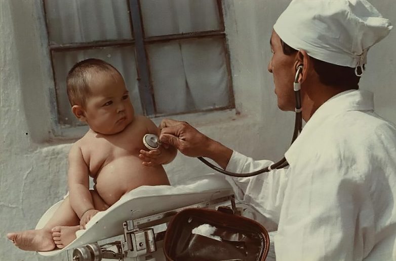 Деревенский детский врач проводит осмотр. Дмитрий Бальтерманц, 1970-е годы