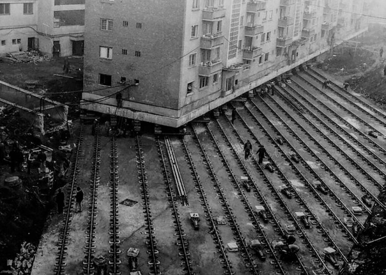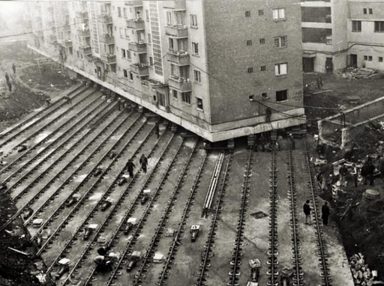 Придумали это совсем не в Союзе, первым целое здание передвинул ещё Аристотель Фиораванти, который когда-то строил Успенский собор Московского Кремля.