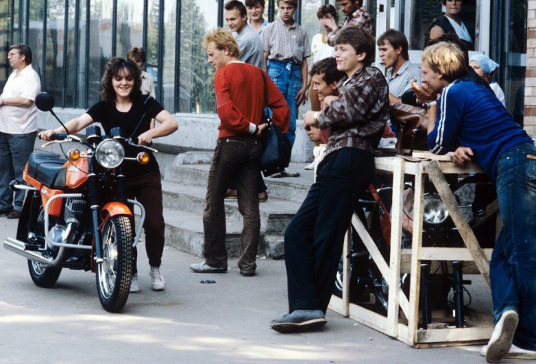 Девушка в магазине ЯВА катит мотоцикл ИЖ, посмотрите внимательно на бензобак и на руль с фарой.