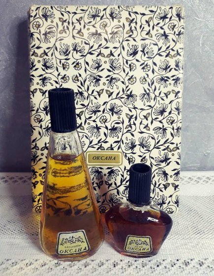 «Оксана» — харьковская парфюмерная фабрика выпускала этот цветочно-древесный аромат как в сольном варианте, так и в виде набора — духи + одноименный одеколон. В обоих случаях парфюм упаковывался в красивую картонную коробку, что сразу придавало простенькому флакону довольно нарядный вид.