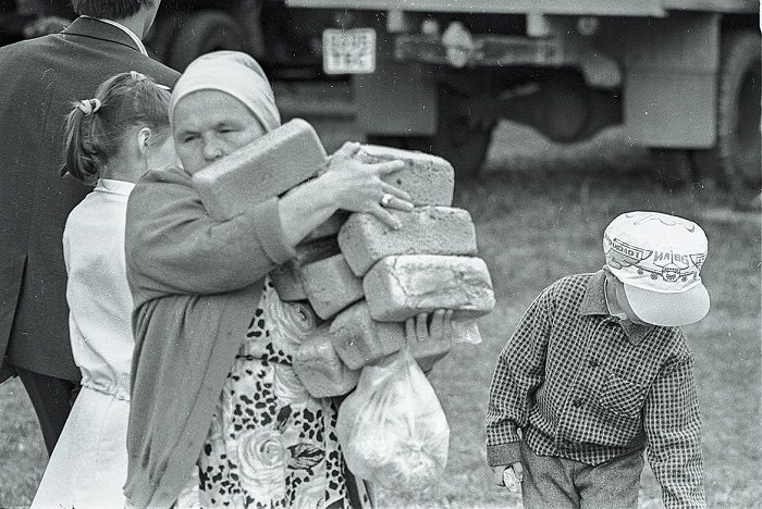 то, что на фото — это не «хлеб с запасом», а «хлеб для свиней» в лихие 90-е было время когда кг хлеба стоил дешевле кг комбикорма, потому что цены на хлеб сдерживали а на комбикорм нет. Вот и тащили по 10 буханок свиней откармлиать…