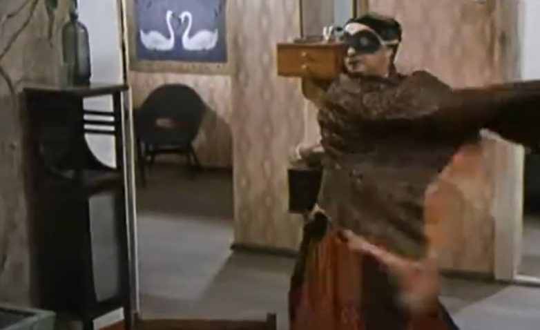 Кадр из фильма. Спасая коллег-женщин от стриптиза, месткомовец Кичкайло исполняет цыганочку с выходом (в роли Кичкайло — Ролан Быков)