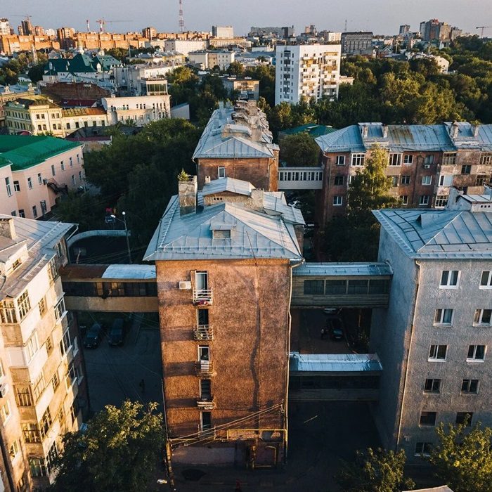 Тот случай, когда на одном странном доме советские архитекторы не остановились, поэтому в Екатеринбурге построили столько домов-коммун, что их набрался на целый квартал. Группа инженеров возвела четыре жилых корпуса, отличающиеся интересной компоновкой по секциям: например, нефиксированное число подъездов — их было либо три, либо четыре, а квартир при этом в пятиэтажном корупе было всего десяток для каждого подъезда.