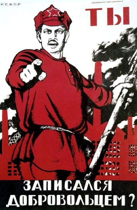 Один из самых известных агитационных плакатов большевиков с изображением солдата в буденовке.