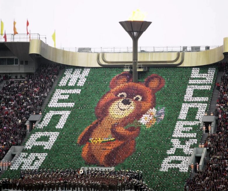 О! Олимпиада-80, как давно это было… Открытие — на трибунах сидят волонтёры и по команде поднимают платочки или дощечки определённого цвета — так получаются меняющиеся картинки. Как здесь вот Мишка.
