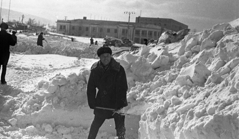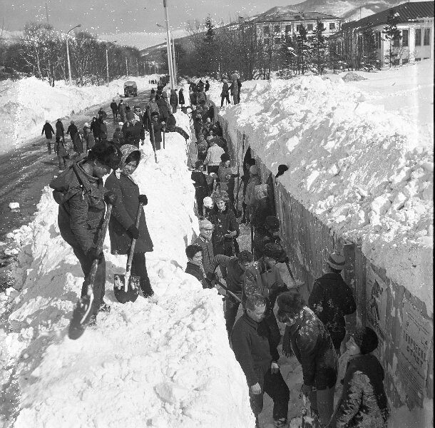 Снежные заносы в городе. 1968 год. Автор: Юрий Садовников. Южно-Сахалинск.