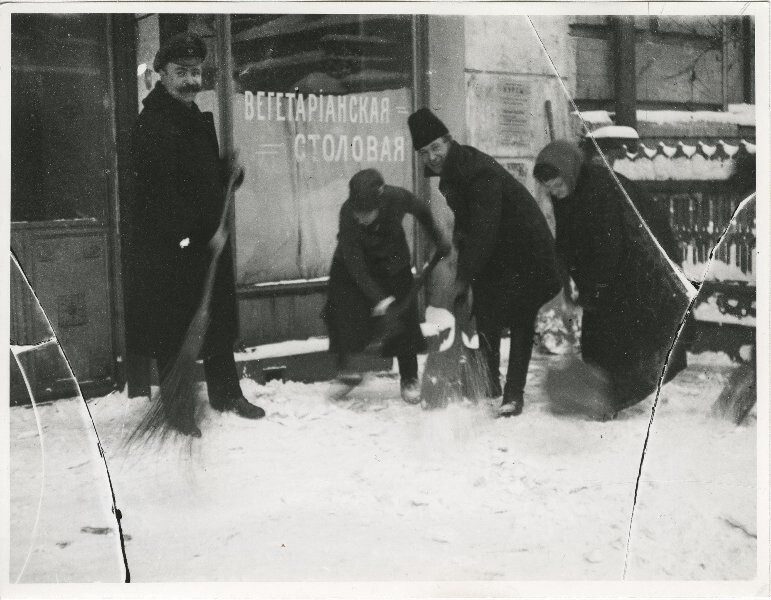 Очистка тротуаров от снега в порядке трудовой повинности. 1919 год. Неизвестный автор. Москва.