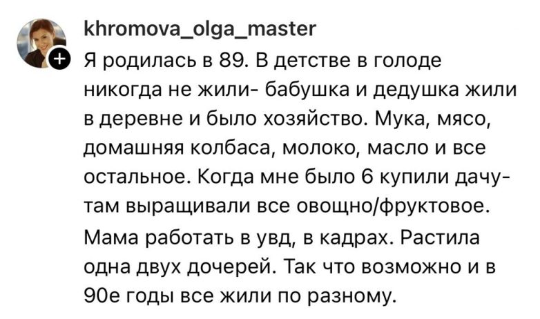 Меня всегда раздражает, когда о жизни в СССР пишут и рассуждают тридцати-сорокалетние мубаки, которые в лучшем случае помнят Горбачёвскую перестройку. Был ли голод в СССР? ДА, БЫЛ. В 1917-25 — первая мировая, революция, гражданская, интервенция и кулачество. В 30-х неурожай и голод в Поволжье, вредительство и саботаж. В 1941-45 Великая отечественная — разрушено полстраны. В остальное время — НЕБЫЛО. Даже Горбачёвскую голодовку голодом назвать нельзя. И я ещё могу понять, когда о скудности ассортимента говорит житель города, но когда о нехватке продуктов ноет житель села — это нонсенс. Не развести кур и не посадить картошку, не откормить свинью, не починить свой дом — надо быть полностью рукожопым.