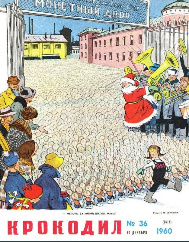Обложка журнала «Крокодил». Рисунок Ивана Семёнова. 1960 год. «— Мелочь, за мной! Шагом марш!»