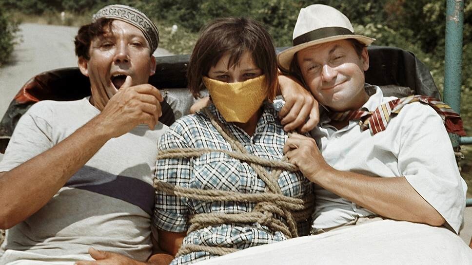 Так или иначе, студентку, комсомолку и спортсменку Нину оценили примерно в 2,3‒2,7 тыс. руб. При этом у самой Нины согласия на брак никто не спрашивал. Невесту решено было похитить. И сделать это чужими руками — с помощью Труса, Балбеса и Бывалого. Три дважды судимых приятеля как раз гастролировали в тех краях. Они зарабатывали деньги не совсем законными, но довольно безобидными способами (сеанс одновременной игры в домино, уроки твиста — все по принципу «плата по таксе, такса — 1 руб.»).