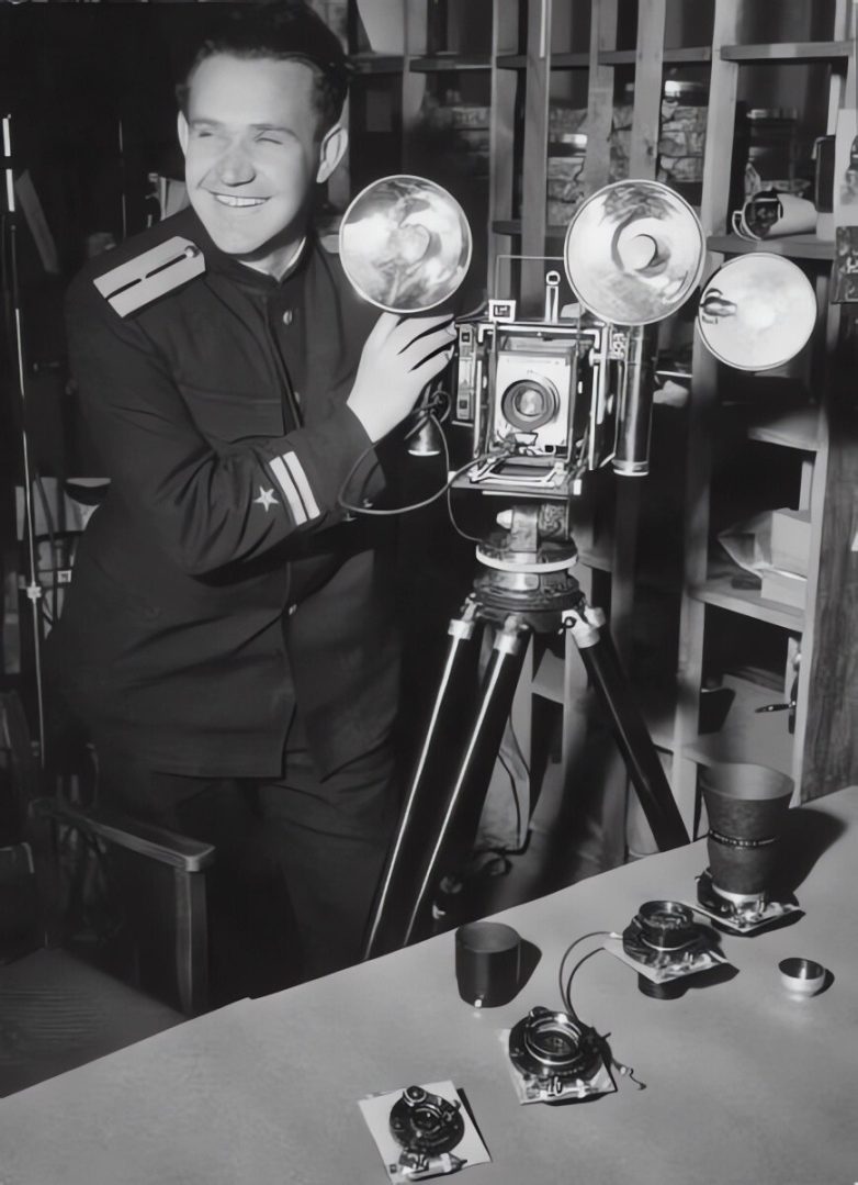 Портрет фотографа в военной форме с фотокамерой Speed Graphic, подаренной Робертом Капой. Автор: Роберт Капа. Нюрнберг.