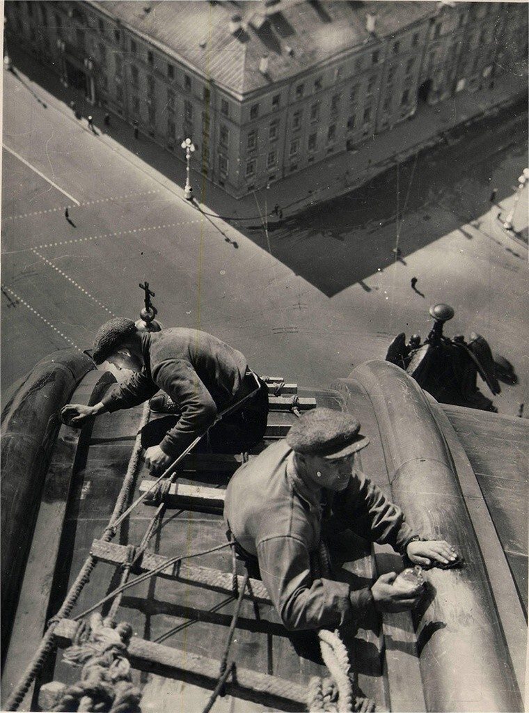 Очистка купола Исаакиевского собора от маскировочной краски. Неизвестный автор. Ленинград.