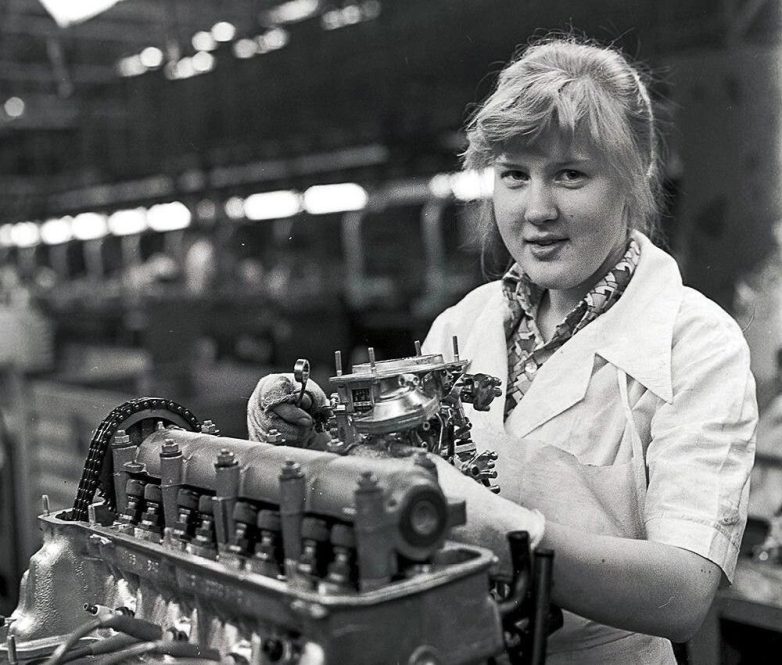 Советская девушка на заводе собираем двигатель Жигулей