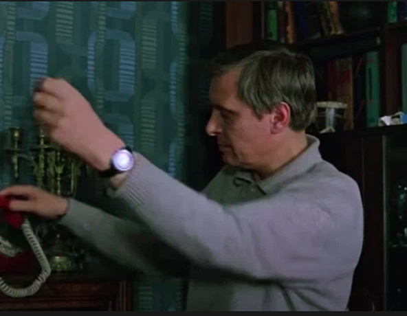 Несмотря на частое мелькание в кадре, рассмотреть толком эти часы невозможно. Но мы точно знаем, что это часы с сигналом. А значит, на руке Олега Басилашвили «Полет» с калибром 2612. Первая советская модель, оснащенная будильником. У часов две заводные головки. Верхняя — это завод будильника и движение сигнальной стрелки, нижняя — обычная функция, завод пружины и установка времени.