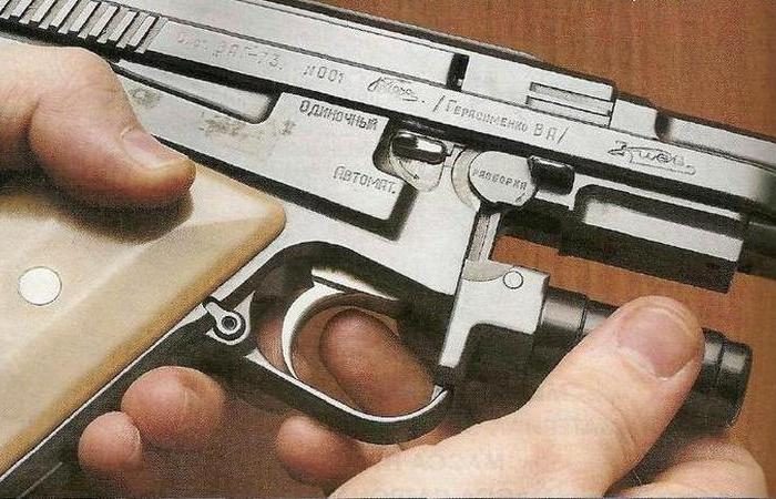 Итак, ВАГ-73 был автоматическим пистолетом под безгильзовый патрон калибра 7.62 мм. Создан он был в 1973 году. За год до этого Герасименко создал «сырую» версию пистолета, которая получила индекс ВАГ-72. Созданная конструктором-самоучкой система позволяла вести огонь как с предварительным взводом курка, так и самовзводом в процессе стрельбы. Экспериментальный пистолет имел два режима огня – одиночный и полуавтоматический (очередями). Для повышения точности стрельбы в автоматическом режиме, Герасименко разработал и внедрил в конструкцию собственный вариант пневматического замедлителя затвора. Помимо патрона и замедлителя затвора, еще одной интересной особенностью ВАГ-73 стал уникальный тандемный магазин с расположением боеприпасов в два ряда, позволявший вместить до 48 патронов. При этом как уже можно было догадаться, экспериментальный пистолет Владимира Алексеевича вышел достаточно тяжелым. Без патронов ВАГ-73 весил 1.2 кг.