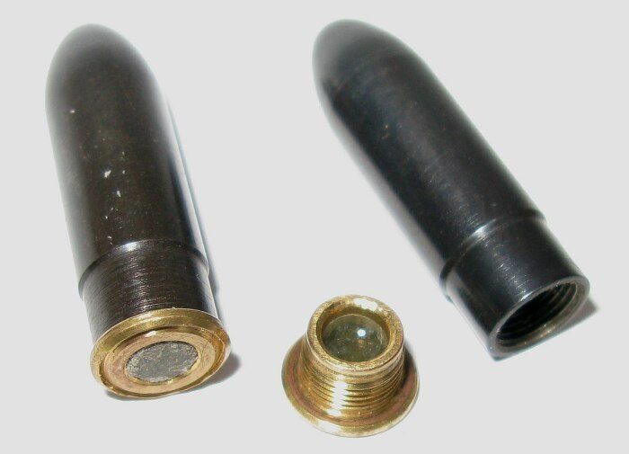 Но конечно же самым интересным аспектом ВАГ-73 был его безгильзовый боеприпас выполненный по так называемой схеме патрон-пуля. При таком подходе пороховой заряд, приводящий поражающий элемент в движение находится в самой пуле. Боеприпас Герасименко имел стальную полость с резьбой в задней части под латунную втулку, которая также выполнялся функцию капсуля. А капсульный состав оружейник-самоучка защитил снаружи при помощи обычной фольги и лака! Таким образом патрон Герасименко был чем-то похож на артиллерийский снаряд.