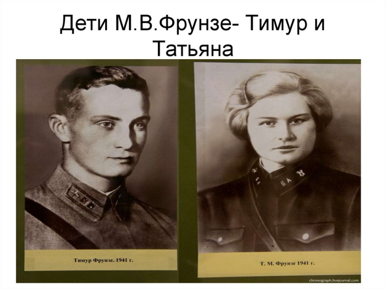 Сын Фрунзе Тимур стал летчиком-истребителем. Храбро сражался с немцами и погиб в воздушном бою под Новгородом. Удостоен звания героя Советского Союза. Отец-воин воспитал сына-воина…