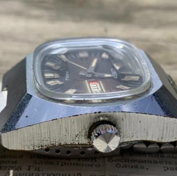 Работали эти часы на механизме 3050. Это центральная секундная стрелка и двойной календарь (дата и день недели). Питался калибр от батарейки в полтора вольта. 3050 — плод коллективных усилий, сделан он был сразу тремя заводами. За разработку и выпуск микросхем отвечали в Минске, резонаторы создавали на Угличском часовом заводе, магниты выпускало предприятие в Кусинске.