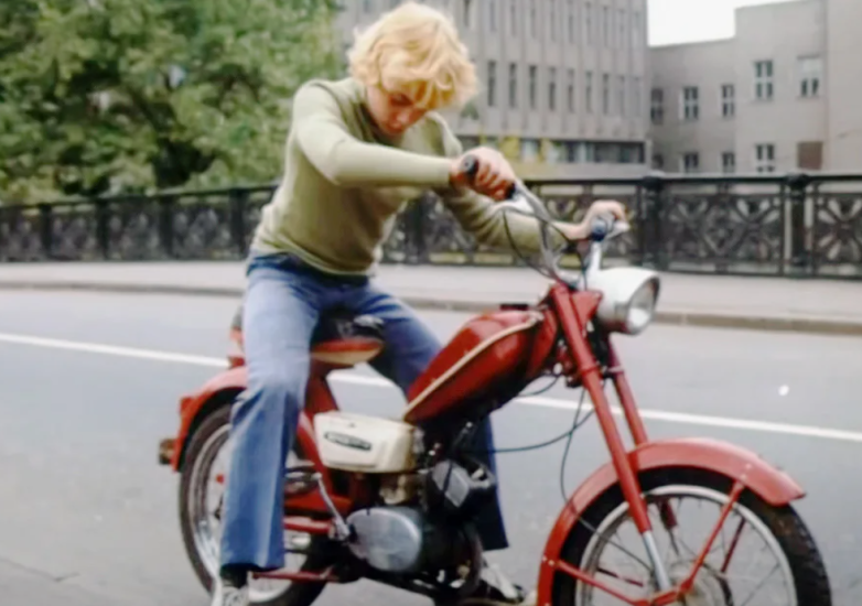 12. Сыроежкин рассекает на мопеде «Верховина 4». Хотя, многие были уверены, что это третья модель ввиду отсутствия хромированной накладки.