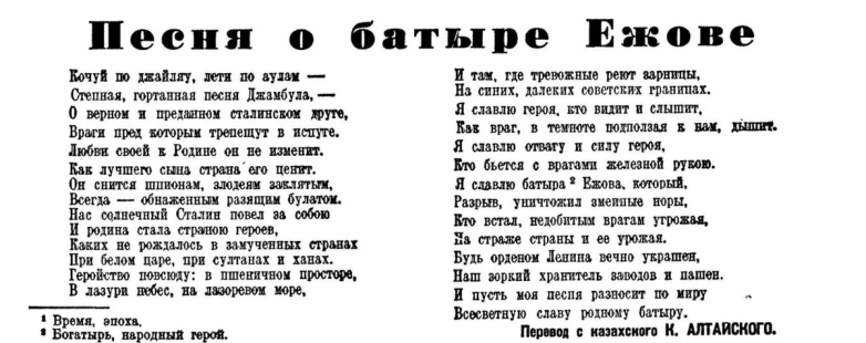 Любопытно, что об аресте расстреле Ежова ничего в советской прессе не сообщалось. Просто был человек, уволился, да потом вдруг взял и исчез. А ведь еще совсем недавно звался «батыром», о котором советский казахский поэт Джамбул Джабаев сложил пламенные стихи-панегирики.