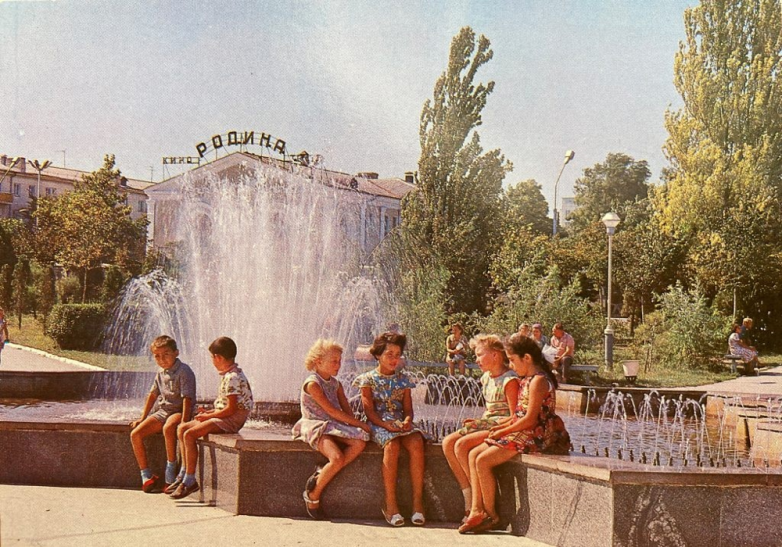 Анапа, Краснодарский край. Фонтан рядом с центральной площадью, на фоне — кинотеатр «Родина».