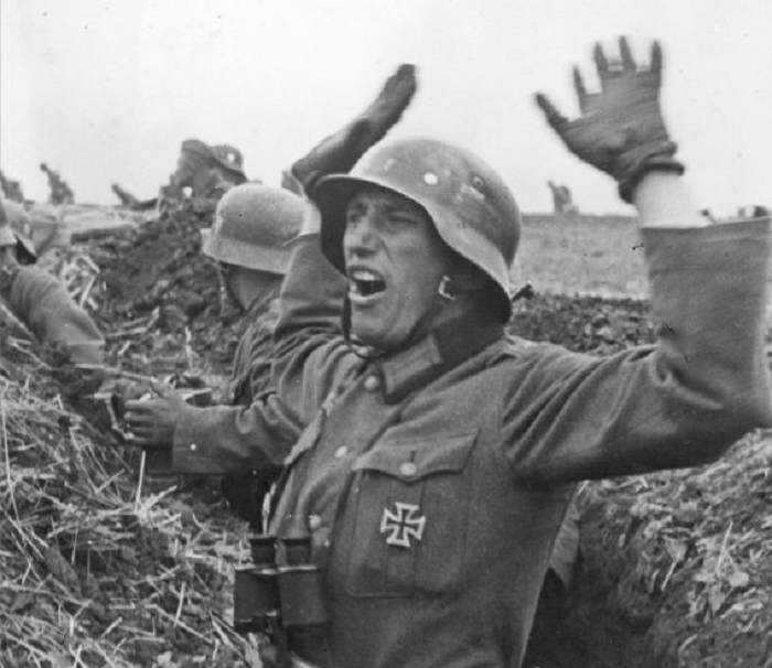 Немецкий офицер поднимает солдат в атаку под Харьковом. Май 1942 года