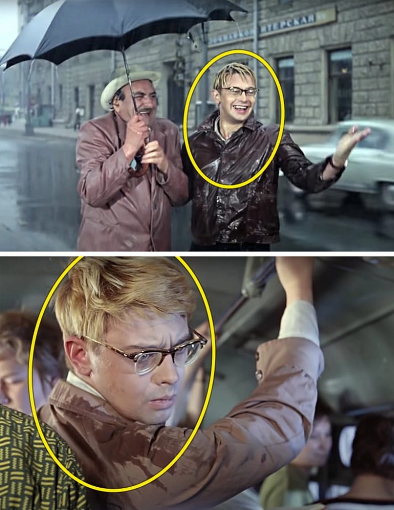 В начале фильма Шурик попадает по ливень и буквально промокает до нитки. Но спустя несколько минут, когда он уже оказывается в автобусе, его волосы выглядят абсолютно сухими, а на куртке остаются лишь незначительные следы от воды.