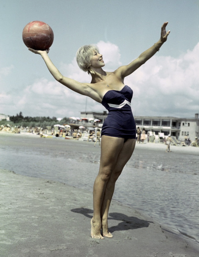 Девушка на пляже в курортном городе Пярну на берегу Балтийского моря, Эстонская ССР, 1961 год