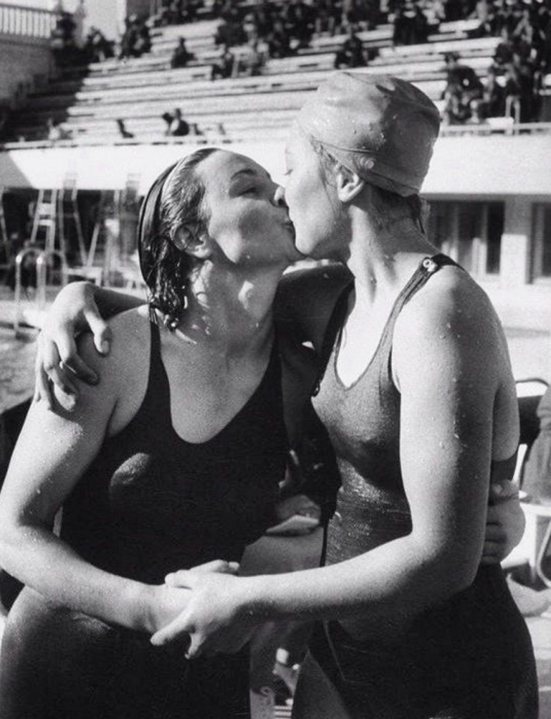 Пловчихи поздравляют друг друга с отличными результатами на Спартакиаде в СССР в 1956 году