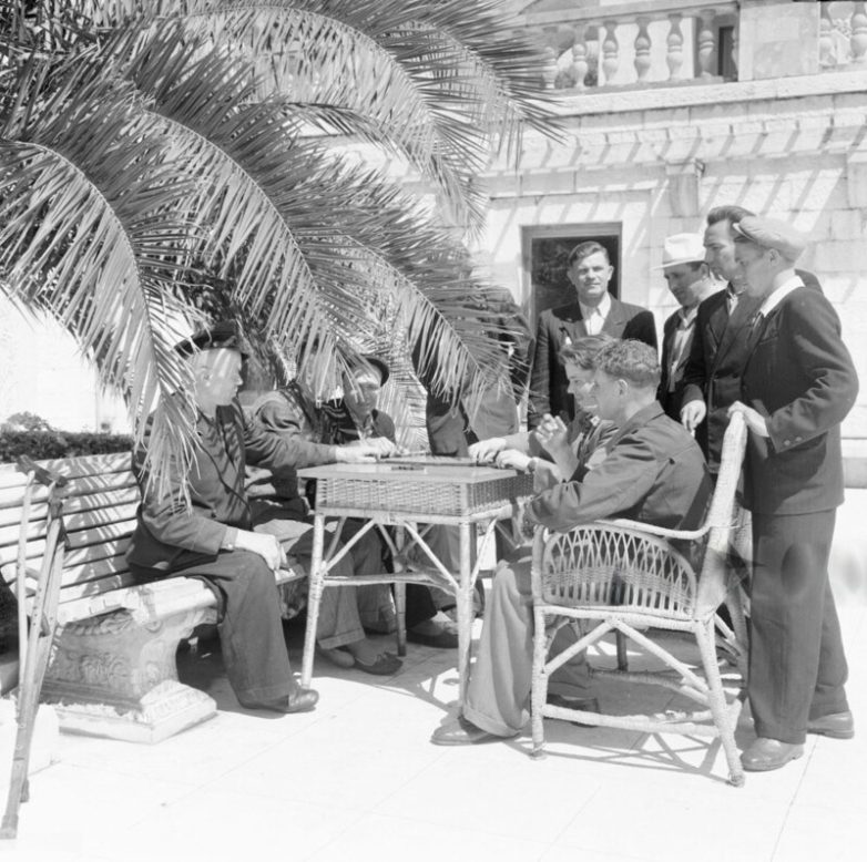 Отдыхающие играют в домино в тени пальмы на набережной Сочи на побережье Черного моря