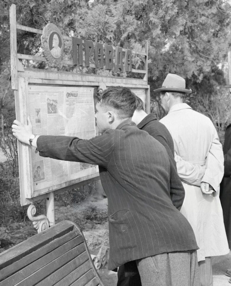 Жители читают официальную советскую газету «Правда» на доске объявлений в симферопольском парке
