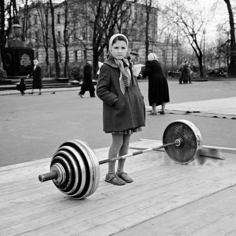 Девочка рассматривает штангу в московском парке