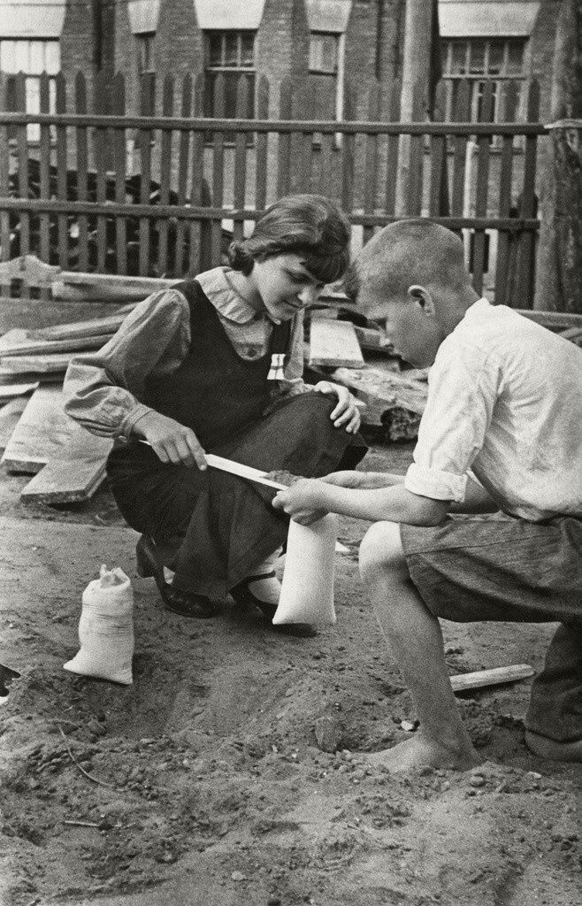 Пионеры наполняют песком мешочки для тушения зажигательных бомб. Июнь – июль 1941 года. Автор: Сергей Васин.