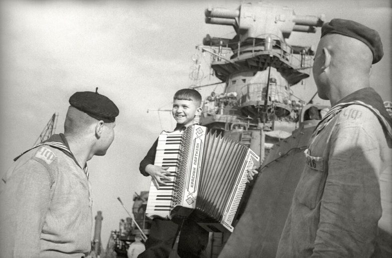 Мальчик с аккордеоном. Крейсер «Красный Крым». 1944 год. Автор: Евгений Халдей. Севастополь.