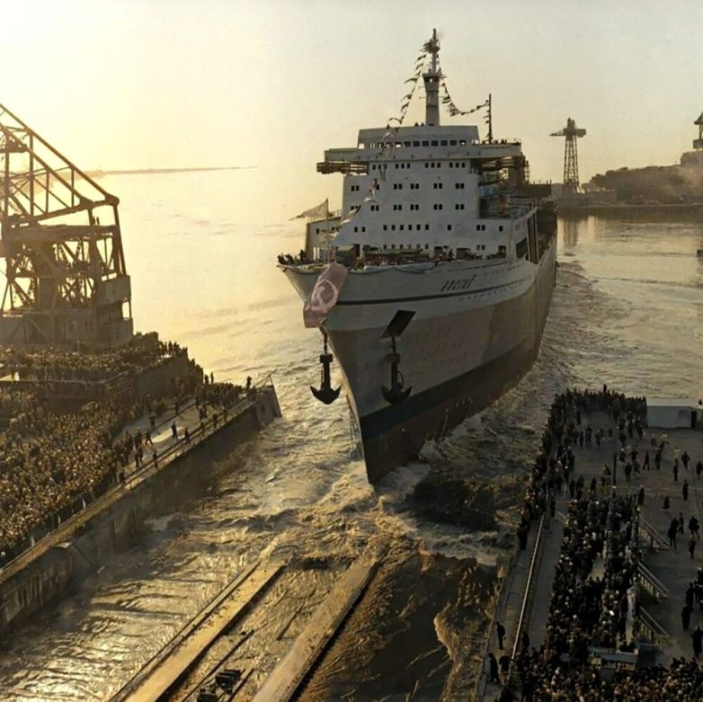 Спуск на воду рыбопромысловой базы «Восток», на Ленинградском Адмиратейском заводе, 1969 год