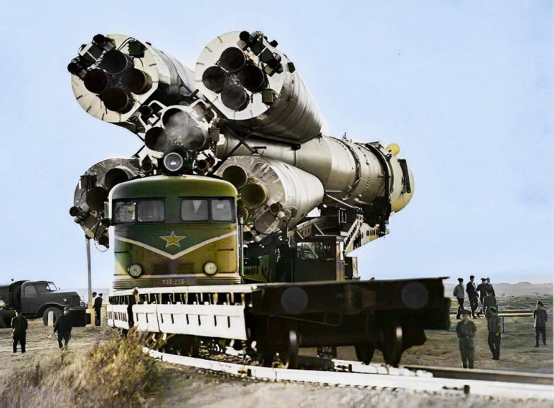 Доставка ракетоносителя с космический кораблем ''Союз'' на стартовую площадку. Космодром Байконур, 1960-е