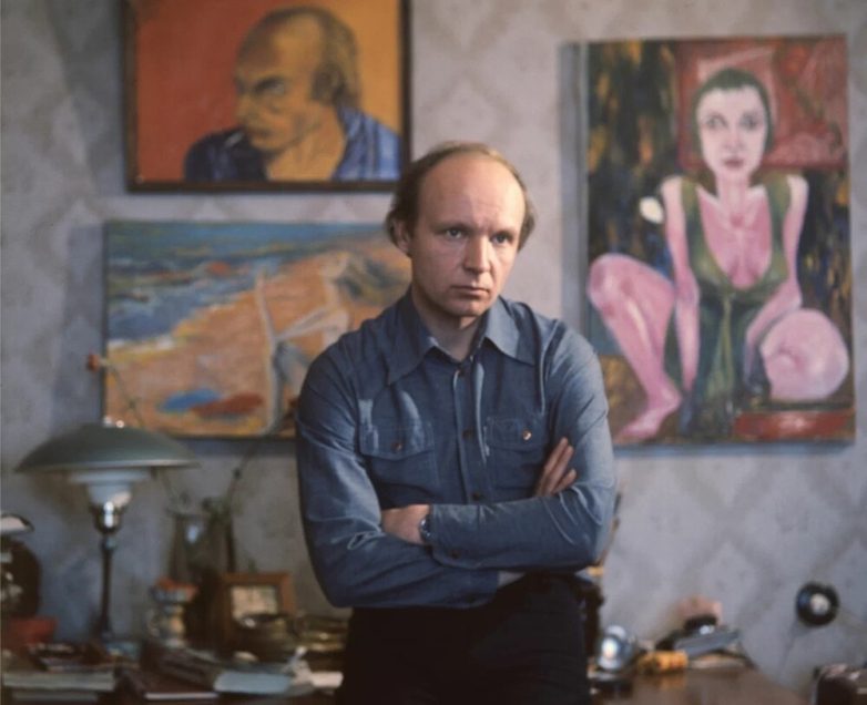 Андрей Мягков дома со своими живописными работами, 1978 год