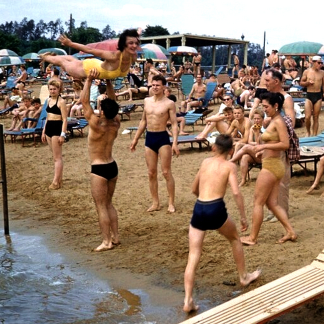 Открытие бассейна «Москва» не отменяет традиционных любимых мест сбора москвичей летом. На пляже в Серебряном бору.