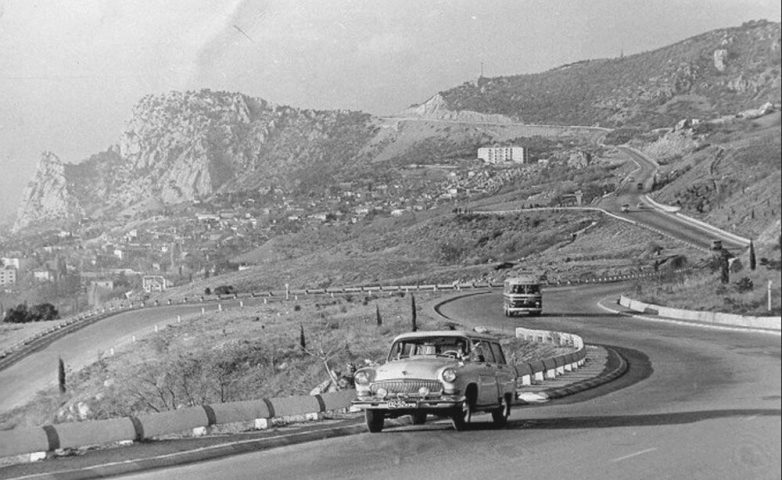 Красивый вид на Южнобережное шоссе и спуск с него на Симеиз. В кадре — Волга ГАЗ-22 и автобус ЛАЗ-695.