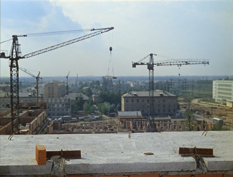 Находилась она в Свиблово — ну а разобраться в местоположении нам поможет комментарий: Съемка велась с крыши восьмиэтажного дома номер 3 по улице Седова (он попадает в кадр и в других эпизодах фильма). В левой части экрана виден строящийся дом 5/2, который чаще всего фигурирует в эпизодах на стройке. Перпендикулярно ему идет строящийся первый этаж дома 7/1, в котором сейчас помещается почта. Стоящей сейчас перед ним двенадцатиэтажной башни 5/1 еще нет и в помине. На дальнем плане в левой части экрана видна строящаяся серая пятиэтажка 9/2 и уже построенная 15/1. Из-за соседства с двухэтажками она кажется немного выше, чем есть на самом деле. Между ними хорошо видна единственная сохранившаяся до нашего времени двухэтажка — 2-й Ботанический переулок, 8. Сейчас она обшита сайдингом и выглядит совсем иначе. Хорошо заметный трехэтажный сталинский дом (9/1) в центре кадра также сохранился, причем ничуть не изменившись (если не считать потемневших стен).