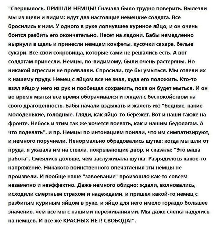 Бабушка рассказывала, что даже в нашей многострадальной Белоруссии находились люди, которые приходу немцев не то чтобы радовались, но и не сильно огорчались. В частности, один сосед по улице говорил, что, мол, немцы это цивилизация. А то, что они коммунистов и евр*ев уничтожают, то «так им и надо»! И вот подумайте, какой случай. Этот сосед при немцах стал работать каким-то слесарем на городской водокачке. И в лютые морозы первой же зимы та водокачка замёрзла. Немцы решили, что это диверсия и того слесаря повесили. Вся улица сказала — «Так ему и надо »!