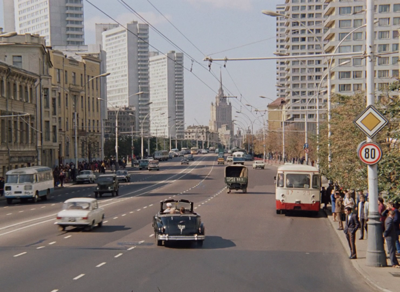 А режиссёр Якин уезжает по проспекту Калинина (Новый Арбат) куда-то в сторону счастливого будущего вместе со своей новой пассией.