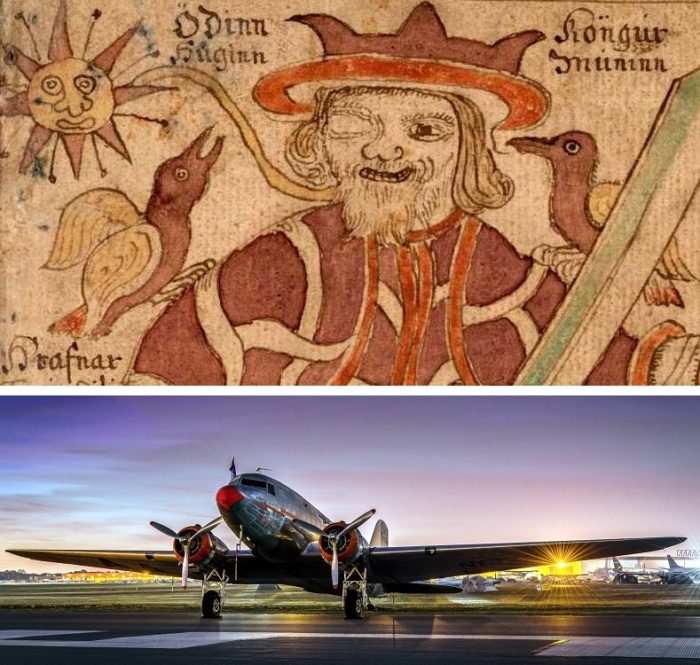 Бог Один и его вороны — Хугин и Мунин. Средневековый рисунок. Внизу — самолет Douglas DC-3.