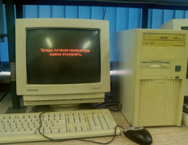 На старых компьютерах вплоть до ОС Windows 98 блок питания никак не был связан с материнской платой, поэтому после завершения работы операционной системы нужно было вручную нажать кнопку выключения на системном блоке, о чем оповещала появляющаяся на мониторе надпись «Теперь питание компьютера можно отключить».
