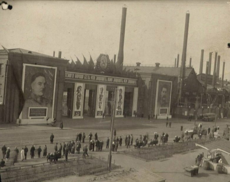 13. Переместимся в Автово и посмотрим на проходную Кировского завода богато украшенную, судя по всему по поводу какого-то праздника.